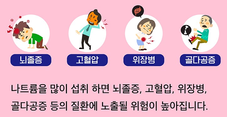 나트륨이 많아지면 우리 몸의 칼슘을 몸 밖으로 빼내는 역할도 합니다. 안그래도 현대인에게 칼슘이 부족한데, 이는 골다공증가은 골격계 질환을 야기할 수 있는 것입니다.