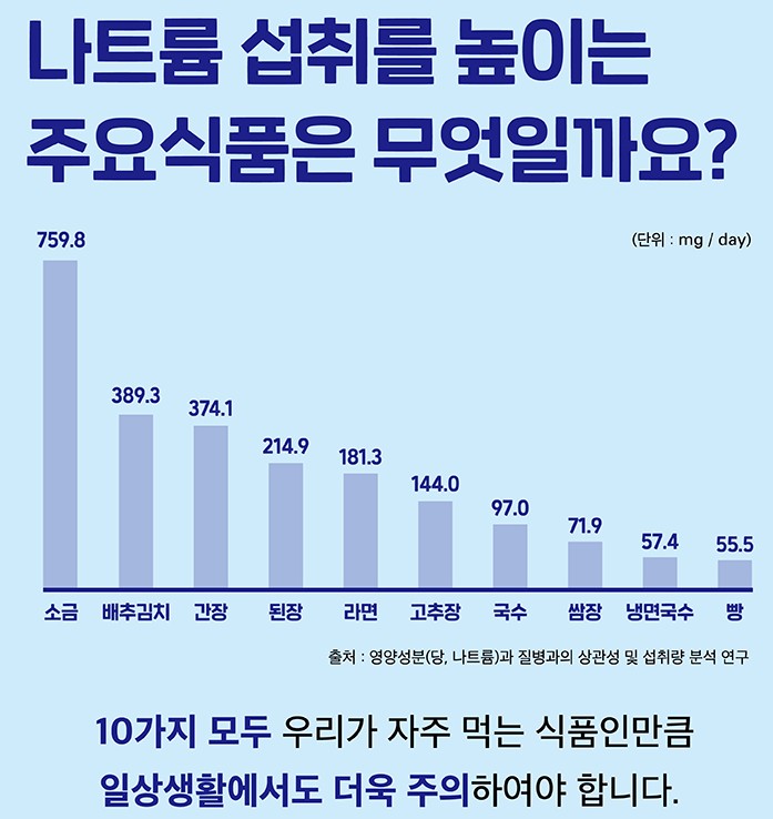 WHO가 기준한 일일 나트륨 섭취량은 2,000mg 정도(소금 5g 정도)입니다. 우리나라는 2010년 그 두 배가 넘는 4,831mg를 섭취하고 있다가 2016년 기준으로 3,668mg 수준으로 많이 줄었습니다. 하지만 여전히 하루 권장 섭취량을 초과하고 있고, 2017년 통계 기준 40~49세가 4086mg으로 가장 많은 섭취를 하고 있었습니다.