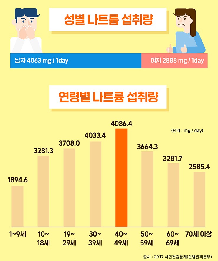 WHO가 기준한 일일 나트륨 섭취량은 2,000mg 정도(소금 5g 정도)입니다. 우리나라는 2010년 그 두 배가 넘는 4,831mg를 섭취하고 있다가 2016년 기준으로 3,668mg 수준으로 많이 줄었습니다. 하지만 여전히 하루 권장 섭취량을 초과하고 있고, 2017년 통계 기준 40~49세가 4086mg으로 가장 많은 섭취를 하고 있었습니다.