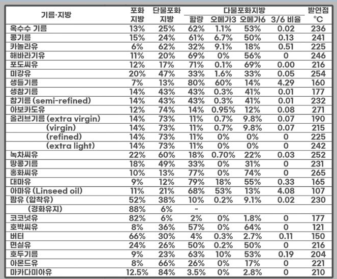 채널H 김소형 원장님(https://blog.naver.com/channel__h)이 정리한 식용유 28종의 지방산 구성과 발연점 표입니다.