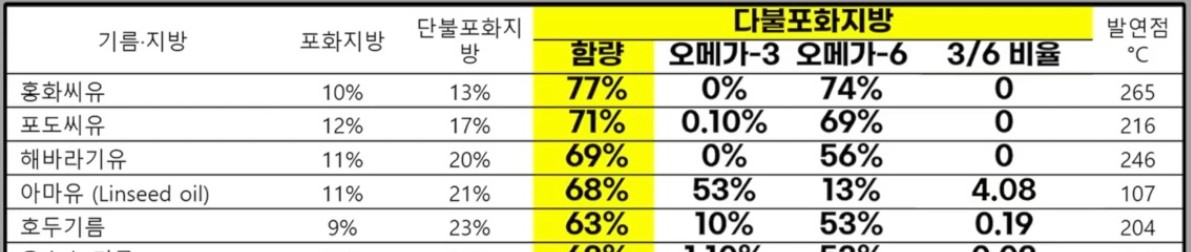 식용유 선택의 핵심은 역시 다불포화지방 함량입니다. 다불포화지지방산 함량이 높은 기름은 홍화씨유(77%), 포도씨유(71%), 해바라기유(69%) 순으로 내려갑니다.