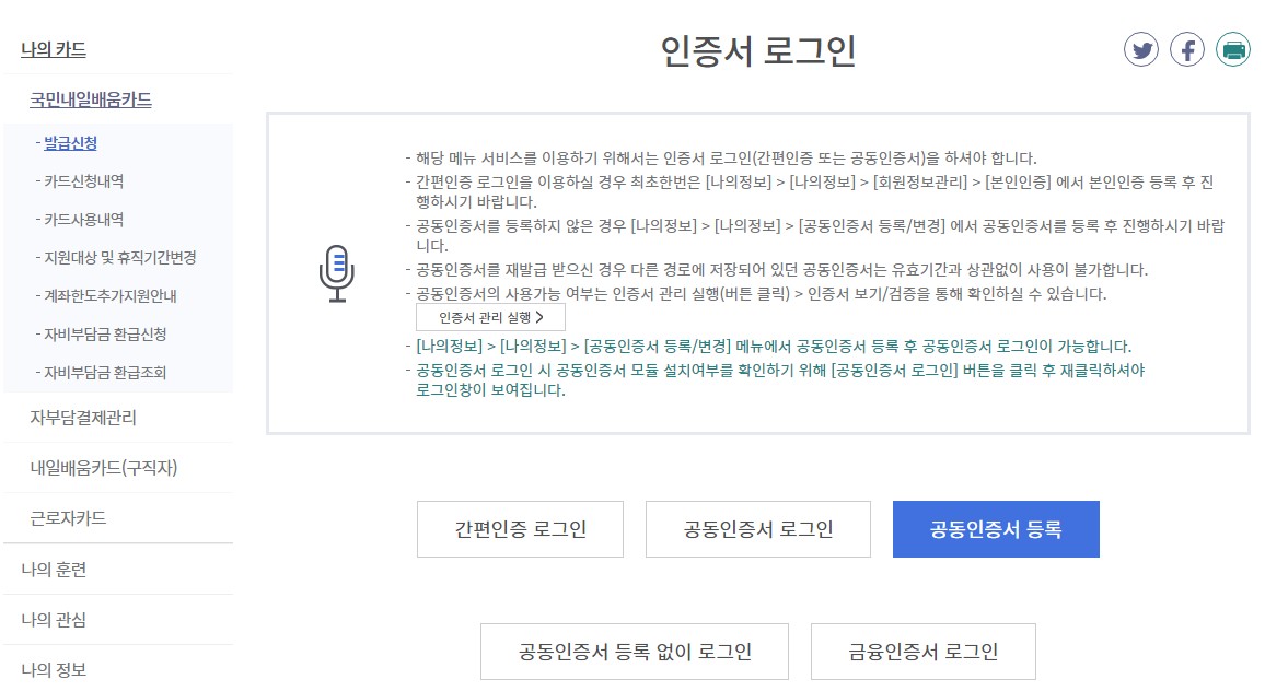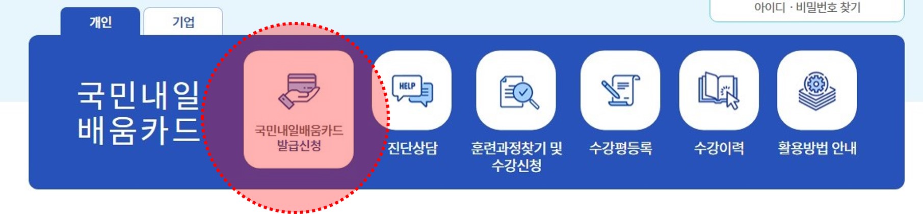 2) 화면 중앙의 [국민내일배움카드 발급신청] 클릭
