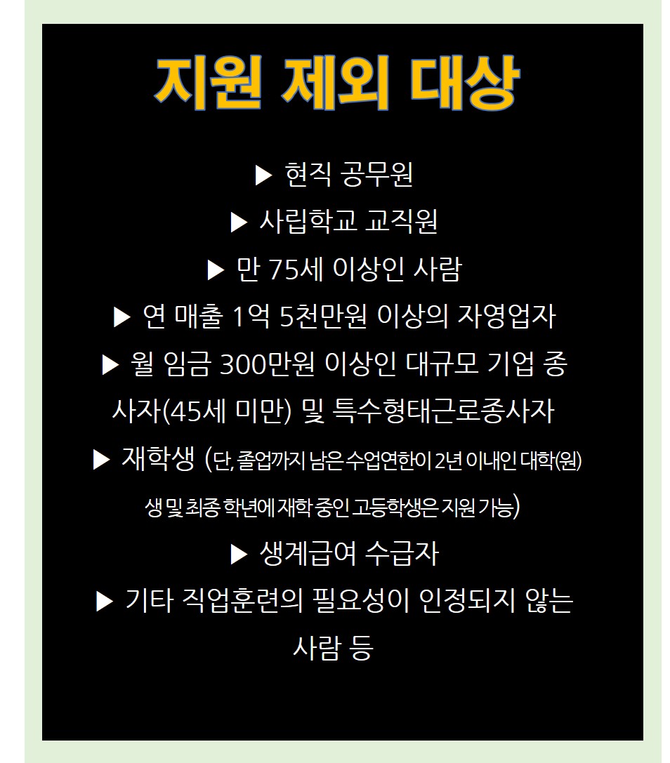 * 국가기간, 전략산업직종 과정, 일반고 특화 과정, K-Digital Training, 산업구조변화대응 훈련 등은 계좌한도를 초과하여 전액 지원 등은 전액 지원(1회만!)