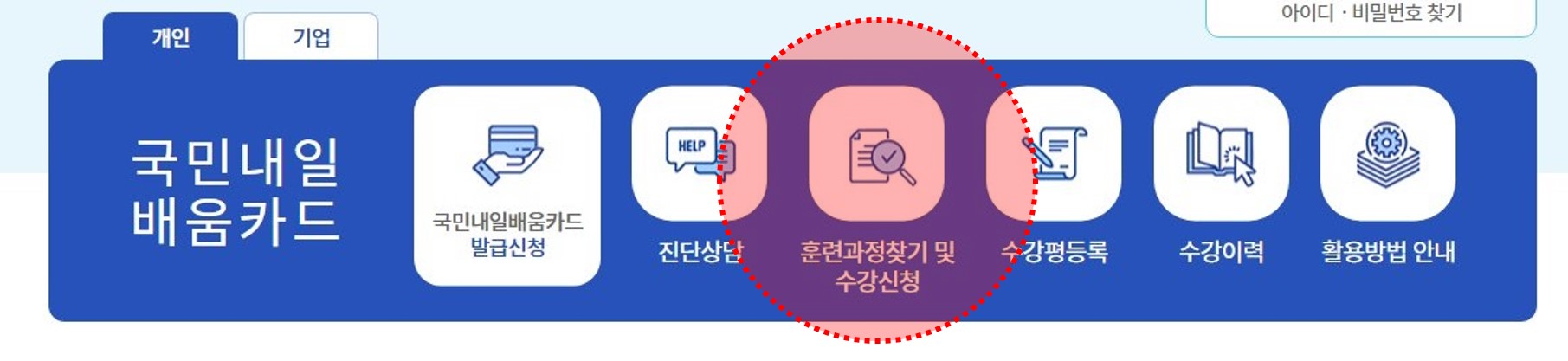 2) 화면 중앙의 [훈련과정찾기 및 수강신청] 클릭
