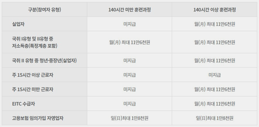* 140시간 이상 훈련을 수강하는 실업자, 저소득 재직자 등에게 최대 116,000원/월 지급(출석률 80% 이상시)