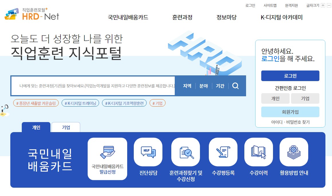내일배움카드를 받았다면 이제 직업훈련포털(https://www.hrd.go.kr/)에서 훈련 과정을 검색, 선택할 수 있습니다.
